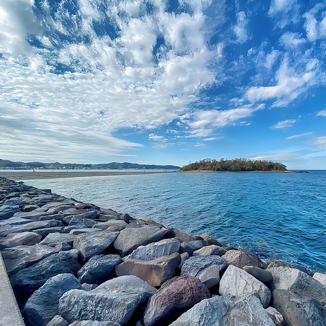 沖ノ島の穏やかなビーチの様子  沖ノ島ビーチから見える海と空